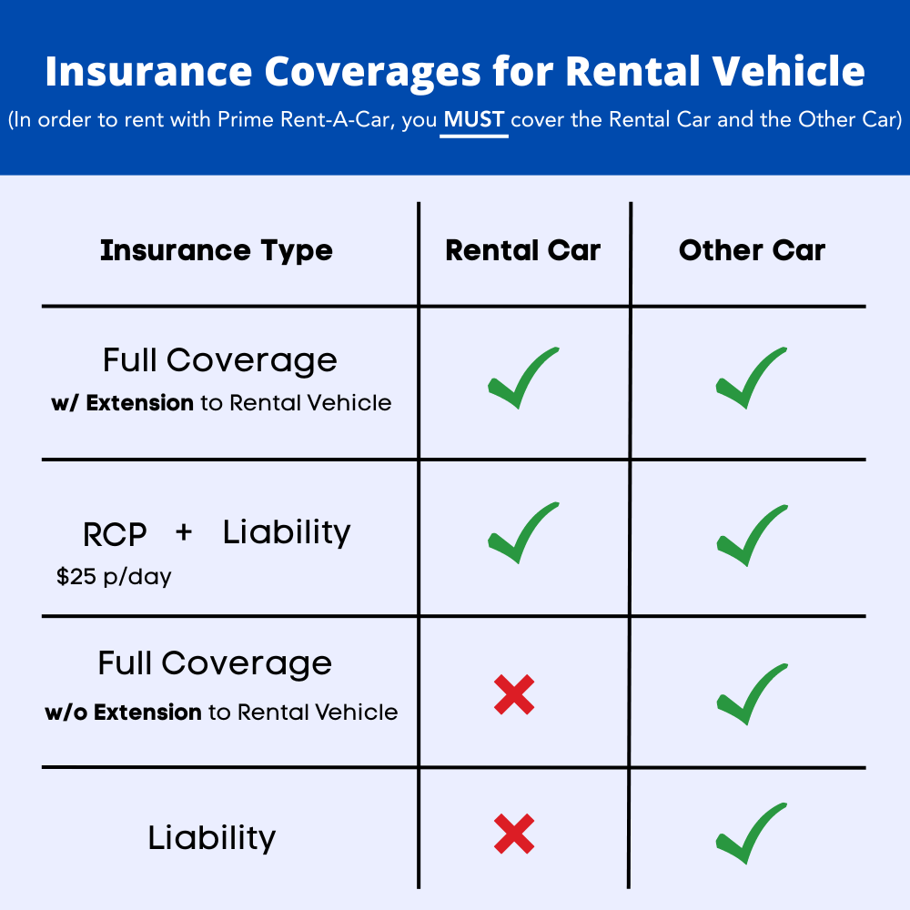 Alternatively, you can purchase Renter’s Collision Protection (RCP) from Prime Rent-A-Car for $25 a day. This protection will cover the cost of repairs to the vehicle for up to $20,000 with a $250 deductible that you would be responsible for paying.